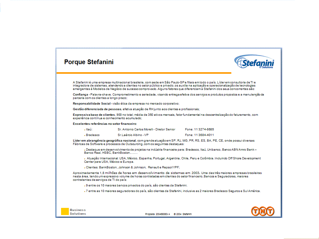 La Stefanini è un' azienda muntinazionale brasiliana, con sede a São Paulo - SP e filiali in tutto il paese. Leader in consulenza di IT e integrazione di sistemi, assistendo ai clienti nel settore pubblico e privato, aiutandoli nella aplicazione e operazione dalle tecnologie emergenti ai Modeli di Negozi, di successo assicurato. Alcuni fattori che fanno staccare la Stefanini dai suoi concorrenti sono:
